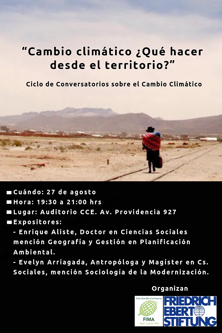4° Conversatorio - Cambio Climático: ¿Qué hacer desde el territorio? 08/26/2019 22:00 to 01/01/1970 00:00 - Auditorio CCE Santiago, Av. Providencia 927 En esta instancia exponen como expertxs en el tema Enrique Aliste y Evelyn Arriagada El 27 de agosto a las 19:30 hrs. en el Teatro del CCE Santiago, se llevará a cabo la cuarta sesión de una serie de conversatorios sobre el Cambio Climático, en miras a preparar a la ciudadanía para la celebración de la COP25 en nuestro país. Esta sesión reunirá a dos expositores que nos contarán sobre qué es la COP 25, cuales son las discusiones que se dan en dicho evento, porqué es importante que se celebre en Chile, cuales son los desafíos que presenta la realización de este evento. Con entrada liberada, este ciclo de conversatorios organizado por ONG FIMA y Fundación Friedrich Ebert (FES) tiene por finalidad entregar distintos conceptos e información relacionada a cambio climático, de cara a la celebración de la COP25 en Chile. En esta versión, se entregará información sobre cómo funciona este evento y cuales son la implicancias que tiene para Chile el hecho de que se celebre este evento en nuestro territorio. En esta tercera sesión puntualmente se abordará funcionamiento de la COP, su importancia y cuales son los desafíos, tanto para el gobierno como para la sociedad civil, que este evento conlleva. Este ciclo de conversatorios pretende entregar a la sociedad civil herramientas y conceptos para comprender el cambio climático con miras a la COP 25 que se celebrará en Chile. Así, se vuelve importante contar con una ciudadanía informada y participativa en las distintas etapas de esta reunión. La actividad es totalmente gratuita y forma parte de una de las líneas de trabajo de ONG FIMA, la cual considera como fundamental la concientización y difusión a la ciudadanía de las temáticas ambientales. Los invitamos a participar de este ciclo de conversatorios ya que es una oportunidad única para comprender a través de la exposición de expertos, conceptos básicos sobre medio ambiente y cambio climático, y prepararnos para la celebración de la COP 25 en Chile.
