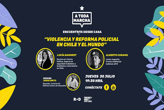 A Toda Marcha: Encuentros desde Casa Nueva edición esta vez con seminarios digitales en torno a diferentes temas coyunturales con invitadxs internacionales. Próximo: 30 de julio, 19:30hrs ¡A Toda Marcha está de vuelta! Se inicia un ciclo de conversatorios virtuales de coyuntura política, impulsado por Revolución Democrática con apoyo de la Fundación Friedrich Ebert en Chile. En estos Encuentros Desde Casa se van a juntar diferentes actores para abordar los temas que muevan la coyuntura latinoamericana hoy en día. El próximo conversatorio será el jueves 30 de julio a las 19:30hrs sobre "Violencia y reforma policial en Chile y el mundo" con: Lucía Dammert, Doctorado en Ciencias Políticas, experta en seguridad ciudadana y académica universitaria, Chile Alberto Curamil, Lonko mapuche, Premio ambiental Goldman 2019 Modera Jorge Brito, Diputado, Comisión de Defensa Cámara de Diputados y Diputadas Inscríbete acá. Todos los conversatorios serán transmitidos a través de las redes de #ATodaMarcha así que atentx a la próxima y si te perdiste alguno, echa una mirada a su cuenta de Facebook o su canal de YouTube. Conversatorios pasados: 17 de junio "Condiciones materiales para resistir la crisis": Catalina Pérez, Presidenta de Revolución Democrática y Juliano Medeiro, Presidente de PSOL desde Brasil 11 de julio "Reflexiones feministas en tiempos de pandemia": Elizabeth Gómez, Ministra de las Mujeres, Géneros y Diversidad, Argentina; Gloria Maira, ex Subsecretaria SERNAM y Coordinadora Mesa de Acción por el Aborto, Chile; Flor Agustín, Feminista Antirracista, República Dominicana 18 de julio "El riesgo del autoritarismo en la crisis": Juan Pablo Luna, Doctorado en Ciencias Políticas, Investigador y Docente universitario, Chile; Sigrid Bazán, Politóloga, ex dirigenta estudiantil, Perú; moderación: Emilia Ríos, concejala para la comuna de Ñuñoa y militante de Revolución Democrática.