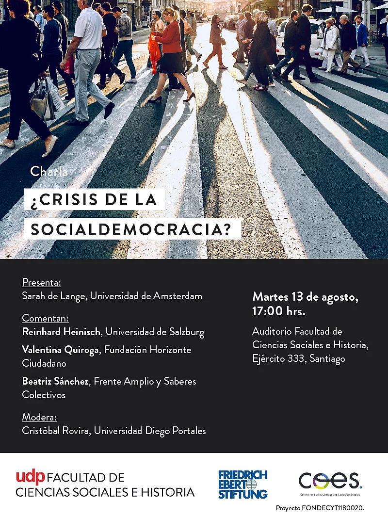 Charla: ¿Crisis de la Socialdemocracia? 08/12/2019 22:00 to 01/01/1970 00:00 - Facultad de Ciencias Sociales e Historia UDP, Ejército 333, Santiago Sarah de Lange presenta su investigación con comentarios por Reinhard Heinisch, Valentina Quiroga y Beatriz Sánchez La Facultad de Ciencias Sociales e Historia de la Universidad Diego Portales (UDP) junto con la Fundación Friedrich Ebert y el Centro de Estudios de Conflicto y Cohesión Social (COES), organizan la Charla ¿Crisis de la socialdemocracia?. En la ocasión presentará Sarah de Lange (Universidad de Amsterdam), con los comentarios de Reinhard Heinisch (Universidad de Salzburg), Valentina Quiroga (Fundación Horizonte Ciudadano) y Beatriz Sánchez (Frente Amplio y Saberes Colectivos). Modera Cristóbal Rovira Kaltwasser, profesor titular de la Escuela de Ciencia Política de la UDP. Los partidos de derecha radical populista han venido creciendo desde los años 1980 en la mayoría de los países de Europa Occidental. Muchos estudios afirman que su éxito electoral es a expensas del apoyo a los partidos socialdemócratas. Como resultado, los partidos socialdemócratas enfrentan complejos desafíos estratégicos, programáticos y electorales debido al auge de los partidos de derecha radical populista. Esta presentación problematiza este supuesto y demuestra que pese a la alta correlación entre las ganancias y las pérdidas de los partidos de derecha radical populista y los partidos socialdemócratas, se pueden observar complejos patrones de votantes que cambian de partido. Interesa argumentar que la precariedad estratégica de la socialdemocracia se origina a partir de la transformación del espacio político en general y no necesariamente debido al surgimiento de la derecha radical populista en particular. ¡Te esperamos! ¿Cuándo? martes 13 de agosto a las 17:00 horas ¿Dónde? Auditorio de la Facultad de Ciencias Sociales e Historia UDP, Ejército 333, Santiago.