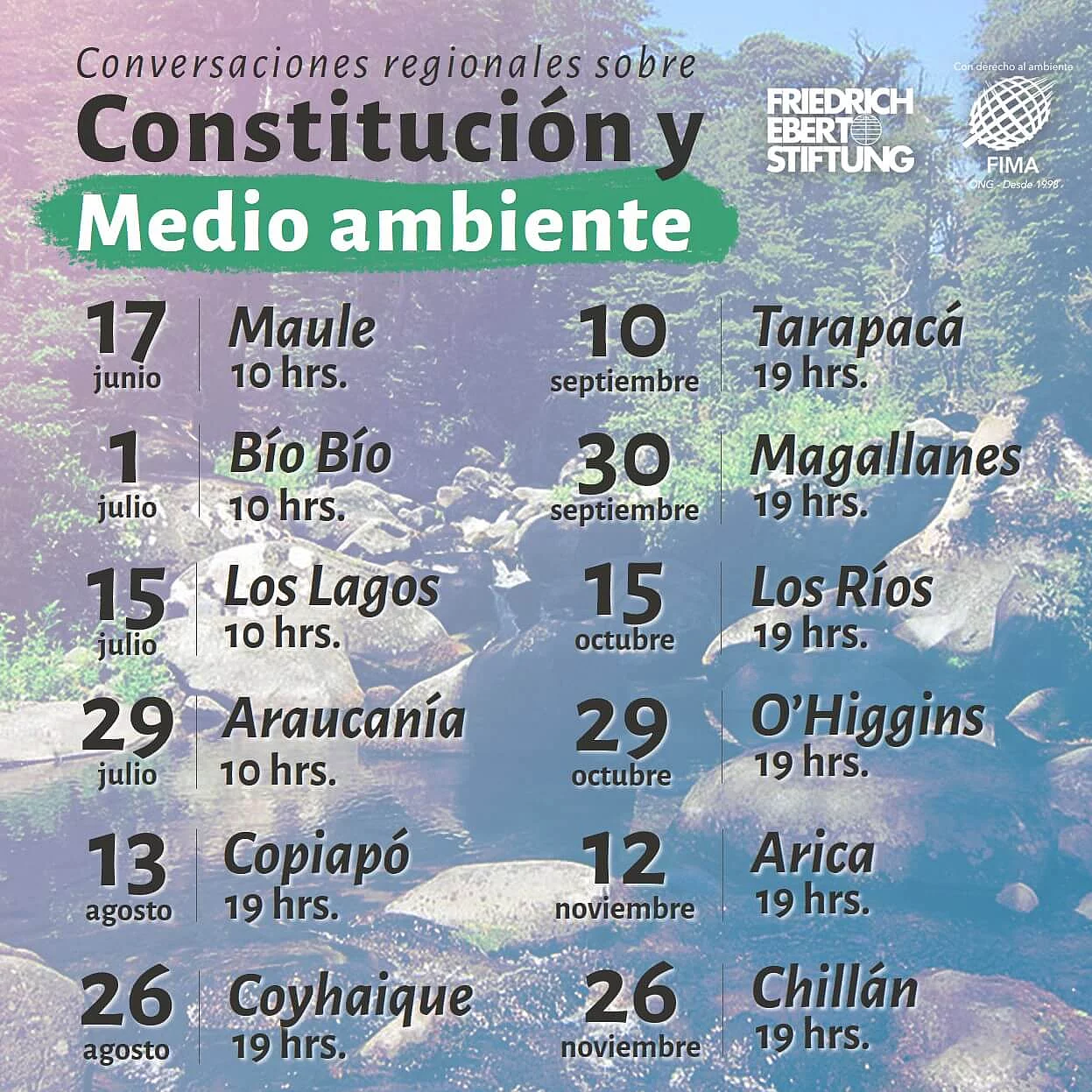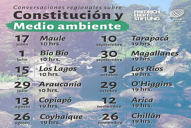 Constitución Ecológica: Conversaciones regionales FIMA ONG organiza ciclo de conversaciones digitales respecto a diferentes regionales de Chile con apoyo de la FES Chile A unos meses del plebiscito, FIMA ONG, con apoyo de la Fundación Friedrich Ebert en Chile, organiza una serie de conversaciones para reflexionar en torno al contenido de una Constitución Ecológica, impulsando la inclusión de los principios de sustentabilidad y respeto al medio ambiente en la nueva constitución. Para reconocer e incluir las diferencias entre las regiones chilenas son 12 conversatorios en total para las diferentes regiones. El próximo conversatorio es el 15 de julio a las 10:00hrs situado en la región de la Araucanía. Conversan: Ezio Costa, Director Ejecutivo ONG FIMAManuela Royo, Abogada, candidata a Doctora Universidad de Talca, parte de Modatima yAlianza Territorial Mapuche.Alejandra Parra, Bióloga en Gestión de Recursos Naturales, Master en Planificación, miembro co-fundadora de la Red de Acción por los Derechos Ambientales RADA. Modera: ONG FIMAInscríbete acá. Revisa la agenda completa: