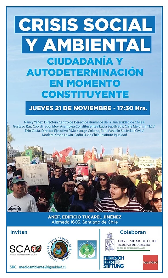 Conversatorio: Crisis social y ambiental - Ciudadanía y Autodeterminación en momento constituyente 11/20/2019 23:00 to 01/01/1970 00:00 - ANEF Chile, Alameda 1603 (con Tucapel Jiménez) Representantes de varias organizaciones sociales y ambientales conversan sobre la crisis y pasos adelante Este jueves te esperamos para conversar de la crisis social y ambiental en Chile ¿Cuándo? 21 de noviembre, 17:30hrs ¿Dónde? Sede ANEF Chile, Tucapel Jiménez con Alameda Contaremos con los insumos y la participación de:Nancy Yañez, Directora del Centro de Derechos Humanos de la Universidad de ChileGustavo Ruz, Movimiento por una Asamblea ConstituyenteLucía Sepúlveda, Chile Mejor Sin TLCEzio Costa, ONG FIMAJorge Coloma, Foro Paralelo de la Sociedad Civilmodera Yasna Lewin, Radio Universidad de Chile e Instituto Igualdad.Inscríbete por mail a medioambiente@igualdad.cl.<wbr /> ¡Todxs invitadxs!Invitan Sociedad Civil por la Acción Climática, Cumbre de los Pueblos 2019 y el Foro Paralelo de la Sociedad Civil en colaboración con Facultad de Derecho de la Universidad de Chile, Instituto Igualdad y Friedrich Ebert en Chile.