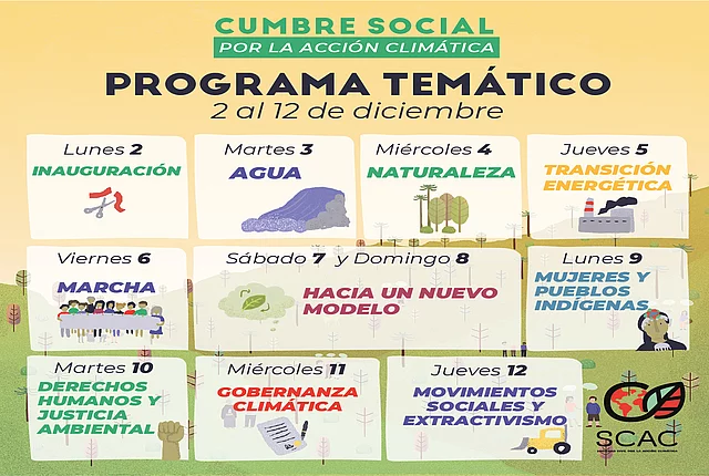 Cumbre Social por la Acción Climática en Santiago, Chile 12/01/2019 23:00 to 01/01/1970 00:00 - Centro Cultural Tío Lalo Parra, Cerrillos, Santiago La FES presente con varias actividades en la Cumbre organizada por la sociedad civil chilena Desde el 2 al 12 de diciembre tendrá lugar la Cumbre Social por la Acción Climática organizada por la sociedad civil chilena. A pesar del cambio de la COP25 de Chile a Madrid, en el Centro Cultural Tío Lalo Parra en Cerrillos, Santiago, se desarrollará un programa diverso y denso con días enfocados en diferentes temáticas: agua, naturaleza, transición energética, cambio de modelo, mujeres y pueblos indígenas, derechos humanos y justicia ambiental y finalmente la gobernanza climática. Como Fundación Friedrich Ebert (FES) Chile estaremos presentes y también desarrollando tres actividades propias el lunes 9 de diciembre. 10:00hrs-11:15hrs, Sala Marcelo Vega: "Chile y el cambio climático: desafíos para las políticas públicas y el progresismo" Panelistas Camila Carrasco, directora Fundación La AlamedaSenador Alfonso de Urresti Laura Gallardo, Profesora titular de la Universidad de Chile, investigadora principal (CR)2 Modera: Christian Sánchez, Director de Proyectos FES Se presentarán y discutirán algunos aspectos del libro “Chile y el cambio climático: Pensar globalmente, actuar localmente” (PDF). El libro desarrolla los desafíos que plantea el cambio climático en diferentes aspectos de nuestra realidad nacional poniendo énfasis en las políticas públicas y los gobiernos locales. 11:30-12:45 hrs, Auditorio Gastón Guzmán, Quelentaro: Dos luchas que son una: Justicia ambiental + justicia social para América Latina y el Caribe Panelistas Astrid Becker, Directora Proyecto Regional FES Transformación Social-EcológicaGabriela Ruales, Feminista ecologista, Colectivo de Geografía Crítica de EcuadorJeanette Sánchez, Directora de la División de Recursos Naturales de la CEPAL Modera: Mariana Blanco, Coordinadora del Proyecto Regional FES Transformación Social-Ecológica ¿Qué alternativas existen a los modelos de desarrollo predominantes? Existe una necesidad de encontrar nuevos caminos de desarrollo tanto en la dimensión social como en la ecológica para hacer frente a las múltiples crisis actuales. 15:00-16:15 hrs, Sala Marielle Franco: Película - La Maldición de la Abundancia / The Curse of Abundance El Yasuní en Ecuador es una de las zonas más biodiversas de la Tierra y hogar para varios pueblos indígenas – pero también se sitúa encima de vastos yacimientos petróleos. Luego del fracaso de una propuesta innovadora del gobierno de Rafael Correa hacia la comunidad internacional para compensar las pérdidas de ingreso por una no explotación de dichos recursos, el gobierno ecuatoriano procedió con la controvertida explotación en esta zona. La película "The Curse of Abundance" de la directora Ewa Ewart fue estrenado en la COP24 en Katowice, Polonia, y muestra la batalla ecuatoriana entre las ambiciones verdes y el modelo económico - un dilema que resuena en todo el mundo. En el corazón de la selva ecuatoriana se refleja un debate global urgente sobre el desarrollo económico, la sostenibilidad y el cambio climático. En última instancia, es una cuestión de nuestra supervivencia. ¿Debemos dejar el petróleo en el suelo? http://thecurseofabundance.com Acá puedes ver el trailer.