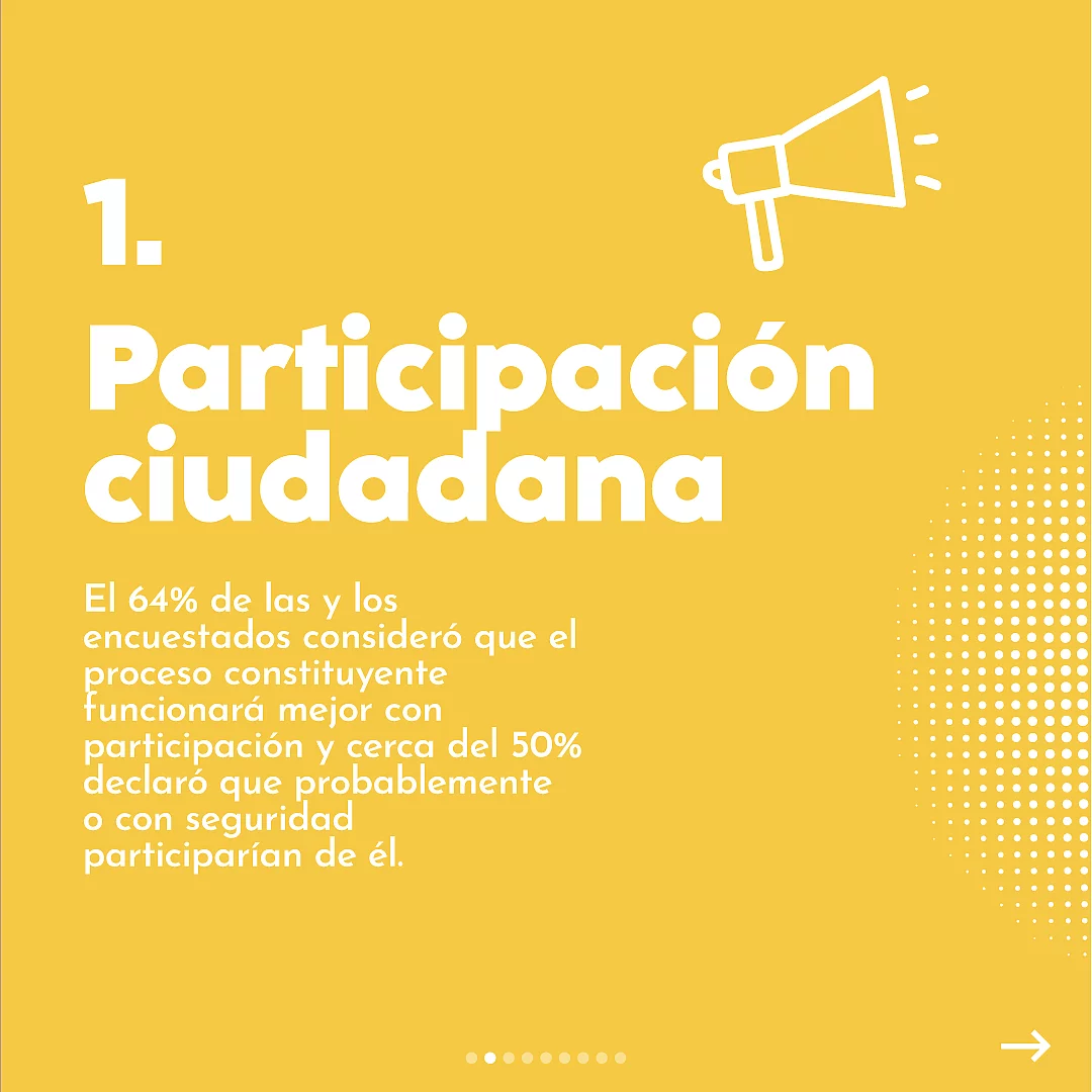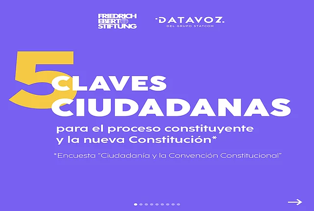 Encuesta FES-Datavoz "Ciudadanía y la Convención Constitucional" Entre octubre y noviembre de 2021 la FES Chile y Datavoz realizaron una encuesta llamada “Ciudadanía y la Convención Constitucional”. Resultados encuesta "Ciudadanía y la Convención Constitucional" Datavoz y la Fundación Friedrich Ebert presentan los resultados de la encuesta amplia realizada a fines de 2021 para explorar las opiniones y el nivel de información que tiene la ciudadanía sobre el proceso constituyente que está viviendo el país. Para ello se realizaron 1.500 observaciones en personas mayores de 18 años residentes en zonas urbanas de Chile entre octubre y noviembre. En el enlace arriba te compartimos el informe con los resultados de este trabajo y te dejamos el archivo para que lo descargues.