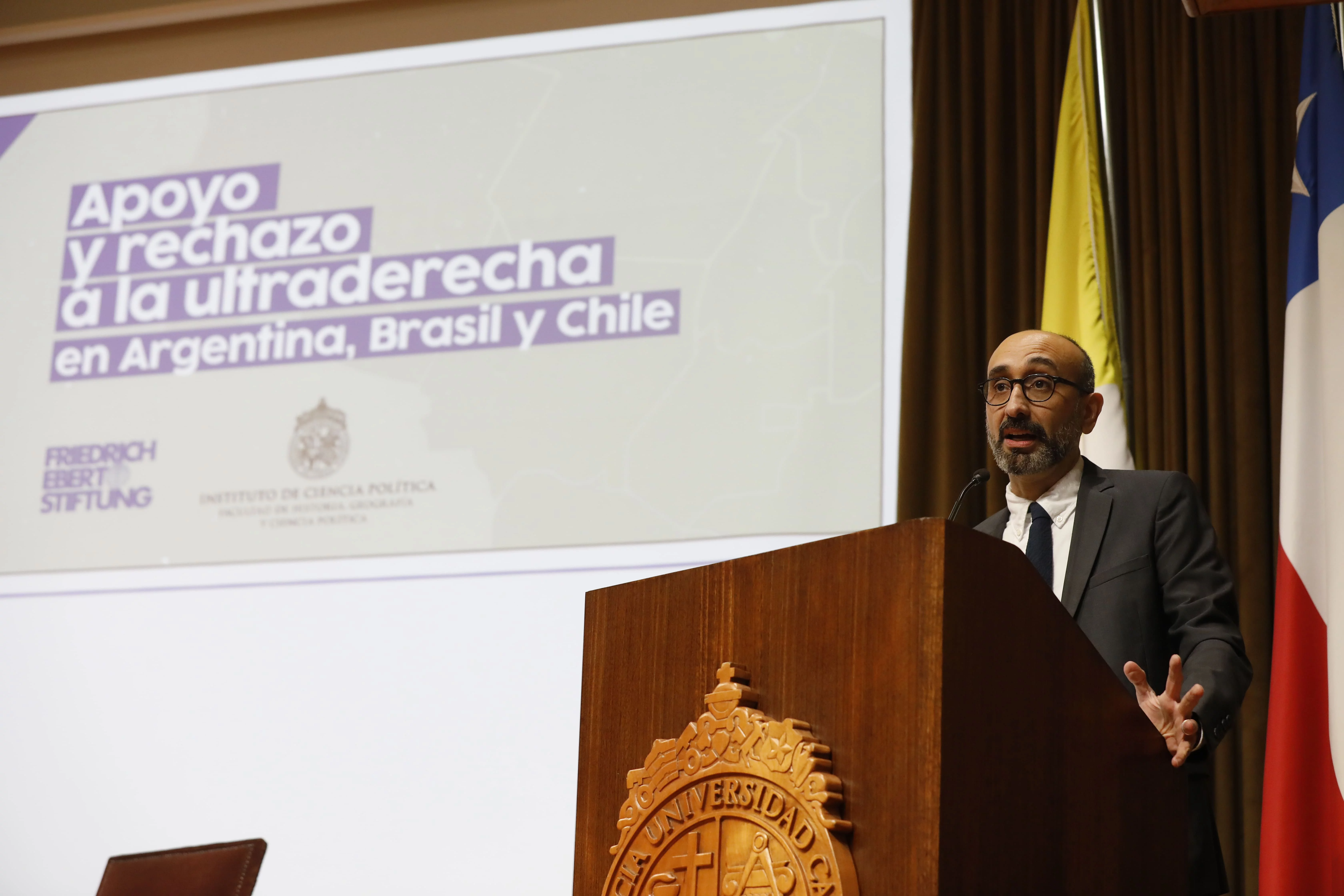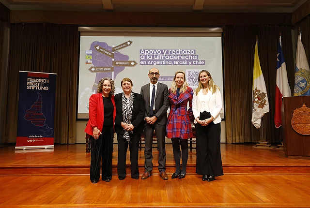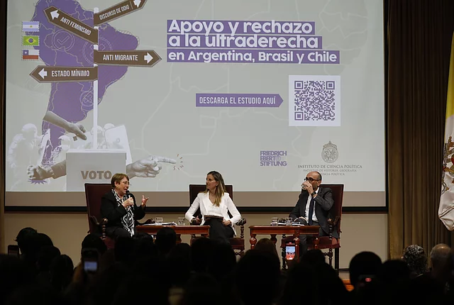 Actividades Noticias Entendiendo el Apoyo y Rechazo a la Ultraderecha en la Argentina, Brasil y Chile 10.09.2024 El pasado jueves 29 de agosto, el Aula Magna Manuel José Irarrázaval de la Casa Central de la Universidad Católica (UC) fue el escenario del seminario titulado "Apoyo y Rechazo a la Ultraderecha en Argentina, Brasil y Chile". La presentación del estudio estuvo a cargo de Cristóbal Rovira, académico y coordinador del estudio, quien ofreció un análisis detallado de los patrones de apoyo y rechazo a la ultraderecha en estos tres países sudamericanos. El evento, organizado por el Instituto de Ciencia Política de la Facultad de Historia, Geografía y Ciencia Política de la UC en colaboración con la Fundación Friedrich Ebert en Chile, comenzó a las 9:30 a.m. El seminario contó con los comentarios de la ex Presidenta Michelle Bachelet y fue moderada por la periodista Paula Escobar. El estudio aborda, entre otros temas, el hallazgo de que un tercio del electorado en Argentina, Brasil y Chile apoya a la ultraderecha, mientras que un 60% se manifiesta en contra. A pesar del ascenso de esta corriente en la región, el análisis revela diferencias significativas en el perfil sociodemográfico de sus seguidores y detractores, así como un patrón ideológico que une a los votantes ultraderechistas en estos países. Si te perdiste el evento o deseas revisarlo nuevamente, te invitamos primero a descargar el estudio completo aquí, para profundizar en los hallazgos sobre el apoyo y rechazo a la ultraderecha en Argentina, Brasil y Chile. Luego, puedes revivir el seminario completo aquí: Seminario Apoyo y Rechazo a la Ultraderecha en Argentina Brasil y Chile This video is provided on YouTube. To look at it, you have to agree to our marketing cookies. Further information can be found in the detailed Data protection information. Accept Marketing Cookies and load video