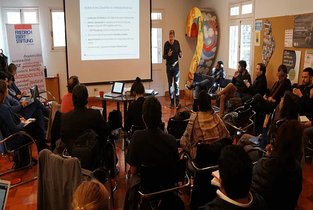 Exitoso taller "COP25 en Chile: Entender para incidir" – Oportunidades y Acciones Estratégicas 06/17/2019 22:00 to 01/01/1970 00:00 - FES Chile Thomas Hirsch, experto internacional en cambio climático, expuso sobre las COP y oportunidades de incidir en ellas Por: Alexandra Tost ¿Qué oportunidades trae la COP25 para los grupos interesados en política climática en Chile y cuál es la mejor forma de aprovecharlas? Para responder estas preguntas, el 18 de junio, la Fundación Friedrich Ebert en Chile ha realizado el taller "COP25 en Chile: Entender para incidir" con Thomas Hirsch, asesor internacional en temas de energía, cambio climático y desarrollo sostenible de Alemania. Durante la jornada, el expositor abordó la base científica del cambio climático, los desafíos y avances en la implementación del acuerdo de París, los hitos en este año de la COP24 hacia la COP25 y las oportunidades y limitaciones de la participación en la COP por dentro y por fuera. Con gran interés participó un total de 30 participantes de la sociedad civil y partidos progresistas – actores que sin duda quieren aprovechar esta oportunidad de tener los ojos del mundo puestos en el país anfitrión y su desempeño en la materia del desarrollo sustentable ante el cambio climático. Aparte de la información presentada, también fueron conversados desde un punto de vista técnico preguntas claves para Chile como la presión de la agroindustria sobre el bosque nativo, la descarbonización y transición energética, el rol del litio en ella y la influencia de grupos de interés privilegiados en las negociaciones. El día concluyó con recomendaciones para la incidencia tales como: Estar atentos a la importante Cumbre Climática de Naciones Unidas en Septiembre en Nueva York. Una expectativa importante para esa fecha es el aumento de las metas climáticas de cada país. En Chile urge un reajuste: Los objetivos hasta el momento están categorizados como “altamente insuficientes”. Esto es el peor rango para un país anfitrión de la COP de los últimos años. En este sentido, es importante definir una estrategia de incidencia para la ruta hacia Santiago, incluyendo los eventos de la cumbre en Nueva York, la PreCOP en Costa Rica y la COP. Parte de ella debe ser una estrategia de comunicación internacional dirigida a la prensa y las delegaciones que estarán presentes en Santiago durante la COP en diciembre. Una buena alianza climática para seguir estos pasos incluiría a ONGs, sindicatos, ciudades, iglesias y empresas y se proyectaría no solamente hacía la COP sino quedaría instalada de manera permanente. Queda en manos de la presidencia del evento, en este caso del gobierno chileno, definir el alcance de los espacios para las contribuciones de actores no gubernamentales a los resultados de COP – otro tema importante a abordar. En conclusión, el día evidenció una serie de oportunidades que pueden ser aprovechados con una serie de acciones estrategias. Lée también la entrevista con Thomas Hirsch en El Desconcierto.