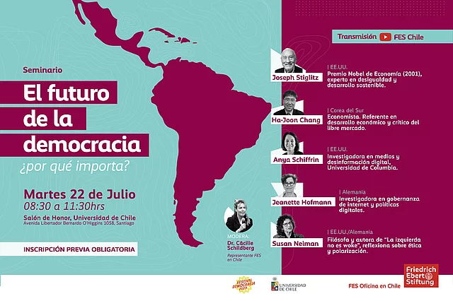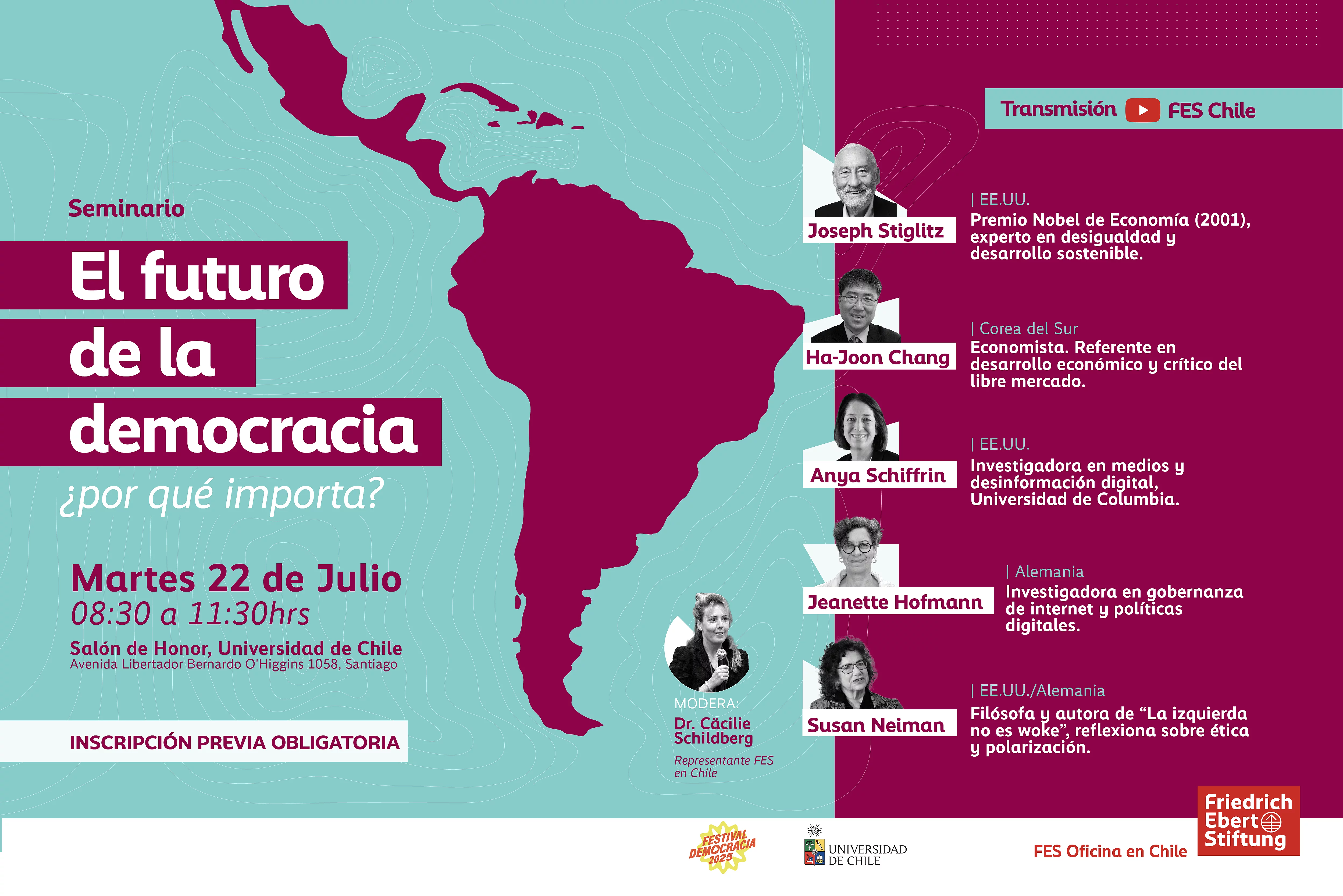 News Actividades Noticias FES Chile invita a panel internacional con referentes globales: El futuro de la democracia, ¿por qué importa? 10.07.2025 El próximo martes 22 de julio, la Fundación Friedrich Ebert (FES Chile) realizará un panel internacional de alto nivel titulado “El futuro de la democracia, ¿por qué importa?”, en el Salón de Honor de la Universidad de Chile. El evento reunirá a destacadas figuras del pensamiento global para reflexionar sobre los desafíos que enfrenta la democracia en un contexto de crisis institucional, desigualdad y transformación tecnológica. El avance del autoritarismo, la desinformación, la polarización y la creciente desconfianza en las instituciones son fenómenos que atraviesan el panorama político actual, tanto en América Latina como en el resto del mundo. Frente a este escenario, la FES Chile convoca a un espacio de análisis y diálogo que busca aportar a la comprensión y renovación de las democracias desde una mirada crítica, interdisciplinaria y comprometida con la justicia social. El panel contará con la participación de referentes internacionales del ámbito de la economía, la filosofía, la comunicación y la gobernanza digital:Joseph Stiglitz (Estados Unidos), Premio Nobel de Economía y profesor en la Universidad de Columbia, experto en desigualdad y desarrollo sostenible. Ha-Joon Chang (Corea del Sur), economista. Referente en desarrollo económico y crítico del libre mercado. Anya Schiffrin (Estados Unidos), especialista en medios, desinformación y tecnología, directora académica en la Universidad de Columbia. Susan Neiman (Estados Unidos/Alemania), filósofa y autora de “La izquierda no es woke”, reconocida por su enfoque ético y crítico sobre las democracias actuales. Jeanette Hofmann (Alemania), investigadora en políticas digitales y gobernanza de internet, vinculada al WZB Berlin y al Instituto Alexander von Humboldt.La conversación será moderada por Cäcilie Schildberg, representante de la FES en Chile.Detalles del evento:Fecha: Martes 22 de julio de 2025 Hora: 08:30 a 11:30 hrs. Lugar: Salón de Honor, Universidad de Chile (Alameda 1058, Santiago) La asistencia es gratuita pero requiere inscripción previa.Será necesario presentar cédula de identidad o pasaporte para ingresar. Este panel forma parte del trabajo que impulsa la FES en América Latina y el Caribe para fortalecer la democracia desde una perspectiva progresista, feminista y participativa.