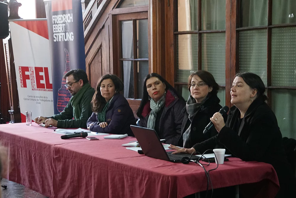 Futuro del Trabajo: Lanzamiento del estudio “Cambio tecnológico, tercerzación laboral e impactos sobre el empleo” Victoria Basualdo de la FLACSO Argentina presentó en la CUT el estudio sobre el futuro del empleo frente a nuevas tecnologías y tercerización El martes 23 de julio celebramos en la Casa Central de la CUT (Central Unitaria de Trabajadores) el lanzamiento del estudio “Cambio tecnológico, tercerización laboral e impactos sobre el empleo”. El estudio fue presentado por la investigadora de la FLACSO (Facultad Latinoamericana de Ciencias Sociales) Argentina y realizadora del estudio, Victoria Basualdo, y comentado por Bárbara Figueroa, Presidenta de la CUT Chile; Arlette Gay, (FES Chile); Paula Rivas (Federación de Sindicatos de Metro - FESIMETRO) y Fernando Carmona (Fundación Instituto de Estudios Laborales - FIEL Chile). La investigadora argentina presentó su estudio, destacando algunos sindicatos argentinos como buen ejemplo para enfrentar a través de la negociación colectiva los problemas que surgen desde la tercerización. El estudio examinó las respuestas sindicales respecto a los cambios de las condiciones laborales en seis actividades económicas en Argentina: industria siderúrgica, agroindustria azucarera, industria automotriz, petróleo, actividad bancaria y telecomunicaciones. Victoria Basualdo destacó los sectores de las telecomunicaciones y el sector bancario como específicamente afectados. A propósito de esto, indica la importancia de la negociación colectiva para enfrentar la automatización y los cambios tecnológicos en estos ámbitos. Como ejemplo menciona el caso de los sindicatos que negocian cláusulas para asegurar la capacitación continua de los trabajadores bajo la presión creciente debido a la automatización y digitalización. Lxs comentaristas subrayaron la importancia del enfoque del estudio argentino y sus hallazgos para el futuro del trabajo en Chile: Arlette Gay, Directora de Proyectos de la FES Chile, señaló el gran valor de redes sindicales al nivel regional y global para enfrentar tendencias globales en el mundo del trabajo y para negociar con las empresas transnacionales. Paula Rivas del Sindicato de Metro destacó también el valor de las redes internacionales de las que forman parte para enfrentar desafíos comunes. Mencionó además la importancia de la solidaridad frente a la práctica de contratar a trabajadorxs tercerizadxs. Bárbara Figueroa relevó el trabajo de la CUT para hacerse cargo del debate en torno al Futuro del Trabajo y buscar las oportunidades a pesar de los desafíos – destacó que esto incluye el tema del trabajo en plataformas digitales entre otros. Además, la presidenta de la CUT argumentó que esta discusión en conjunto con otros debates nacionales lleva a una discusión más amplia sobre el modelo de desarrollo y el rol de los sindicatos en su transformación. Si te lo perdiste, puedes leer el estudio acá en versión PDF. Puedes ver algunas partes del lanzamiento en vídeo en cut.chile en Facebook. También puedes leer la nota publicada en la página web de la CUT con audios de las intervenciones de Victoria Basualdo. Fotos: FES Chile Galería