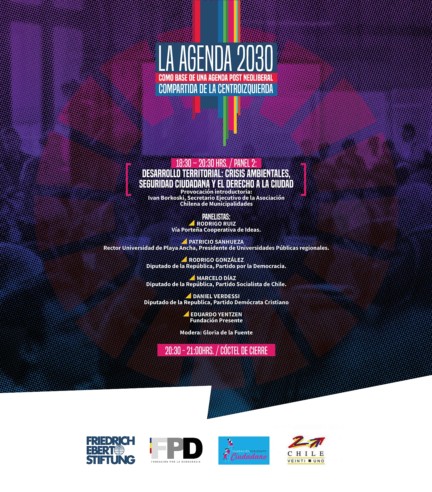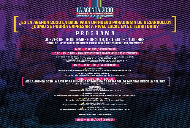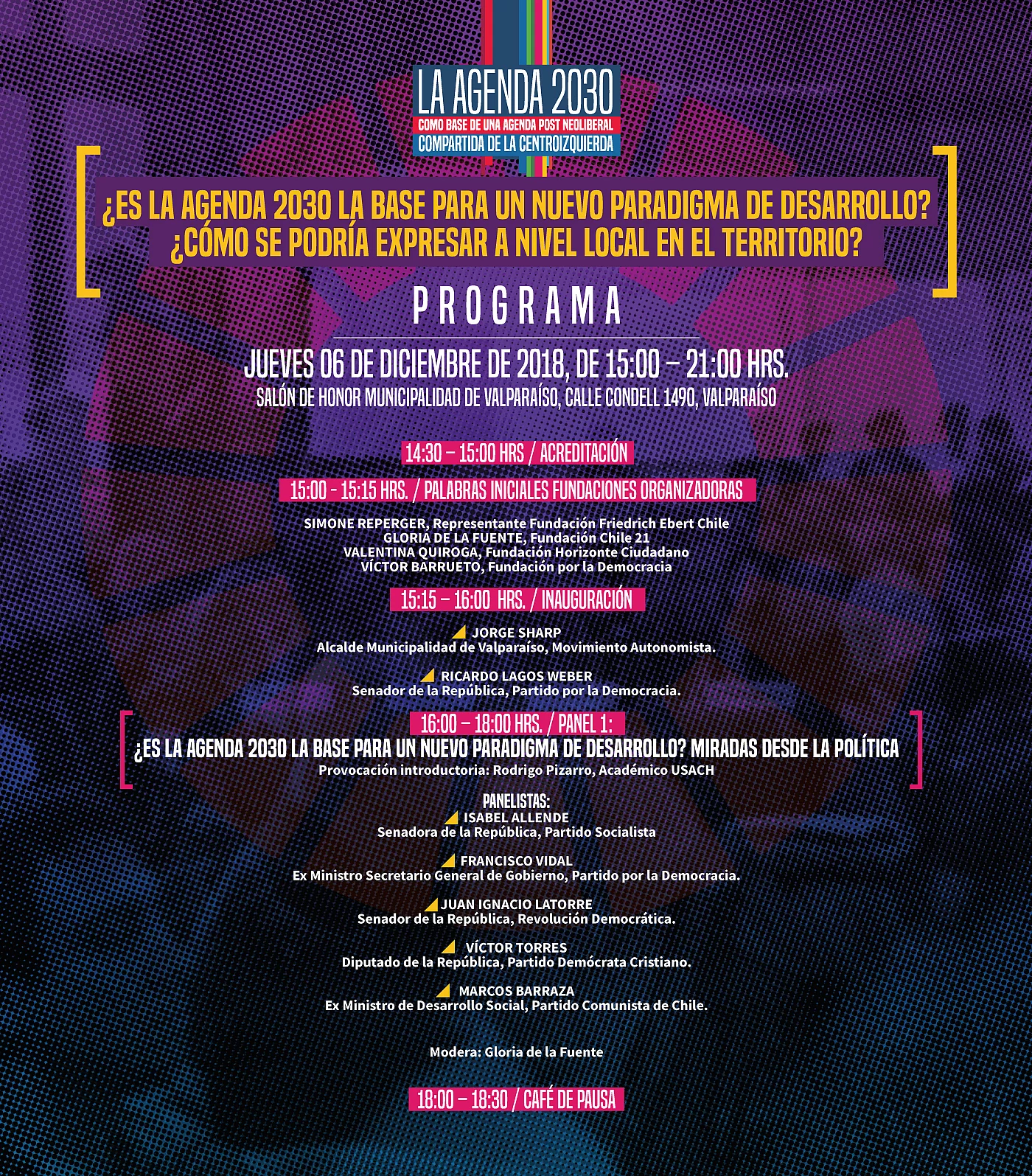La Agenda 2030 como base de una agenda post neoliberal compartida de la centroizquierda 12/05/2018 23:00 to 01/01/1970 00:00 - Municipalidad de Valparaíso ¿Es la Agenda 2030 la base para un nuevo paradigma de desarrollo? ¿Cómo se podría expresar a nivel local en el territorio? Las fundaciones Por la Democracia (FPD), Friedrich Ebert, Horizonte Ciudadano y Chile 21 invitan al seminario "¿Es la Agenda 2030 la base para un nuevo paradigma de desarrollo? ¿Cómo se podría expresar a nivel local en el territorio?". El evento se realizará el día jueves 6 de diciembre, entre las 15:00 y las 21:00hrs, en la ilustre Municipalidad de Valparaíso, ubicada en calle Condell 1490, Valparaíso. Finalizaremos con un cóctel. Inscríbete acá.