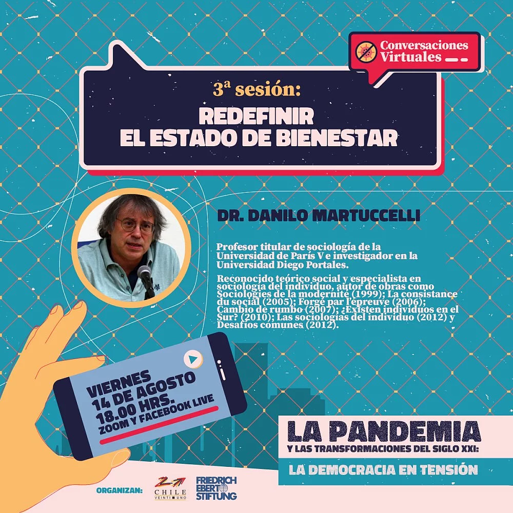 La pandemia y el inicio del Siglo XXI: la democracia en tensión Ciclo de webinars organizado por Chile 21 y FES Chile con expertxs nacionales e internacionales ¡Súmate a este ciclo de webinars en torno a Chile como una democracia en tensión! Organizado por la Fundación Chile 21 y la Fundación Friedrich Ebert, pone en discusión algunos pilares de la democracia y el efecto de la pandemia y otros factores en ellos. Aprovechamos la oportunidad para intercambiar con expertxs nacionales e internacionales. La segunda sesión te espera este viernes 14 de agosto a las 18.00hrs en Zoom y Facebook Live. El tema: Redefinir el Estado de Bienestar. Para participar en Zoom, inscríbete acá. Te invitamos a escuchar a y conversar con: Dr. Danilo Martuccelli, Profesor titular de sociología en la Universidad de París V e investigador en la Universidad Diego Portales. Reconocido teórico social y especialista en sociología del individuo, autor de obras como Sociologies de la modernité (1999); La consistance du social (2005); Forgé par l’épreuve (2006); Cambio de rumbo (2007); ¿Existen individuos en el Sur? (2010); Las sociologías del individuo (2012) y Desafíos comunes (2012). Introduce y Modera: Dr. Daniel Grimaldi Director del Área Ideas Políticas Fundación Chile21 En la primera sesión hablamos de Poder, actores y valores en Oriente y Occidente con Juan Enrique Serrano, Dr. Ciencia Política, Univ. de Paris 1, Francia. Especialista en sociología política y derecho comparado Chile-China. UFRO; María Montt: Dra. Estudios Culturales Latinoamericanos, Univ. Manchester, UK. Especialista en relaciones culturales y diplomáticas entre China y América Latina. PUC y Andrés Bórquez, Dr. Ciencias Políticas y Políticas Internacionales, Univ. de Fudan, China. Especialista en economía internacional y Asia. Universidad de Chile La segunda sesión tuvo como tema Ser humano y naturaleza - Fragilidad y redefinición de los límites de lo humano con Anahí Urquiza, Doctora en Sociología, Universidad Ludwig Maximilian Alemania; Especialista en medioambiente y sociedad; Investigadora del Center for Climate and Resilience Research - CR2 y Cristián Simonetti, Doctor en Antropología Social, Universidad de Aberdeen, Escocia; Especialista en antropología del Antropoceno, Investigador principal del FONDECYT "Futuros Concretos".