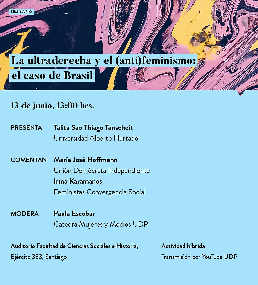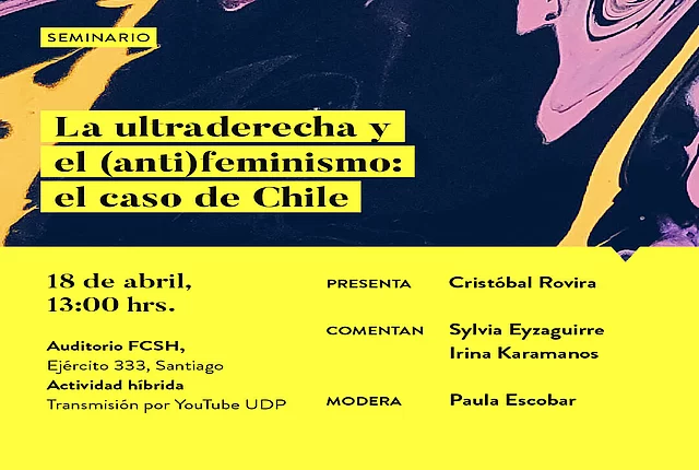 Actividades Democracia Política internacional Noticias La ultraderecha y el (anti)feminismo 09.06.2023 Ciclo de seminarios analizando los casos de Chile, España y Brasil ¿Cuál es la relación entre la ultraderecha y el (anti)feminismo? Con esta pregunta en mente realizamos un ciclo de tres seminarios analizando los casos de tres países: Chile, España y Brasil. Como primer presentador sobre el caso de Chile nos acompaña Cristóbal Rovira, autor del documento de análisis "Apoyo y rechazo a la ultraderecha en Chile" entre otros estudios relacionados. El análisis del caso de España lo presenta Lisa Zanotti y finalmente el caso de Brasil lo analiza Talita Sao ThiagoTanscheit. La moderación está a cargo de Paula Escobar y como comentaristas contamos con Irina Karamanos, Sylvia Eyzaguirre, Marcela Sabat y María José Hoffmann según el caso. Las sesiones se pueden ver en su canal de YouTube. Revisa acá las conversaciones en torno a Chile, España y Brasil.