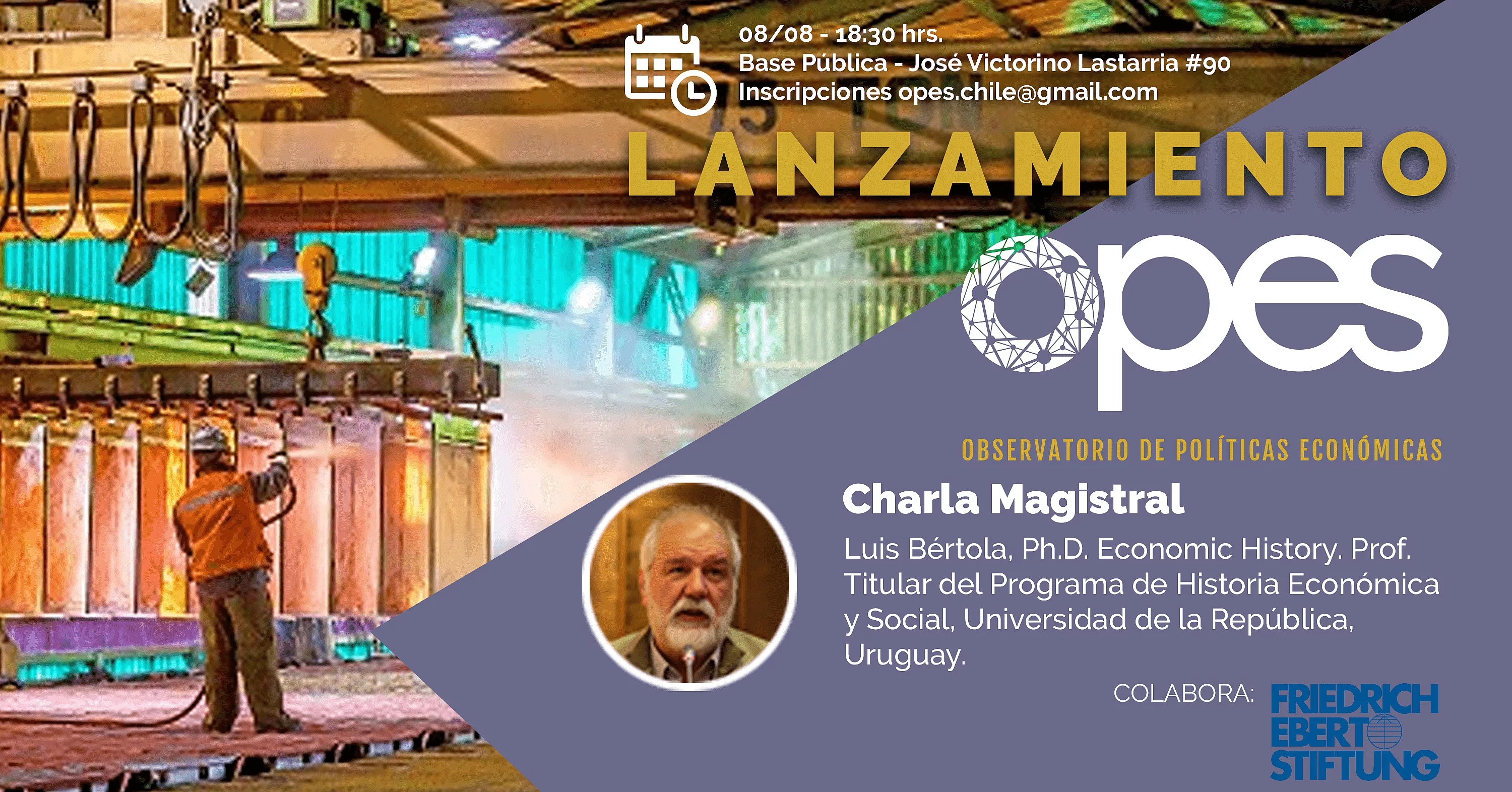 Lanzamiento del Observatorio de Políticas Económicas (OPES) con invitado especial 08/07/2019 22:00 to 01/01/1970 00:00 - Base Pública, José Victorino Lastarria 90, Santiago Acompáñanos en la charla magistral del experto Luis Bértola, Ph.D. en Historia Económica, con ocasión del lanzamiento de OPES El Observatorio de Políticas Económicas (OPES) es un centro de pensamiento que realiza investigación aplicada y difusión enfocada en la elaboración e implementación de políticas públicas.Con ocasión de su lanzamiento y con el apoyo de la Fundación Friedrich Ebert, el OPES tiene el agrado de invitarle a la Charla Magistral Políticas económicas para el desarrollo de América Latina: El rol de la historia, la economía política y el cambio estructural dictada por el destacado académico Luis Bértola, Ph.D. Economic History, Universidad de Gotemburgo, Suecia. Profesor Titular del Programa de Historia Económica y Social, Facultad de Ciencias Sociales, Universidad de la República, Uruguay. Si quieres participar, inscríbete mandando un mail a opes.chile@gmail.com.