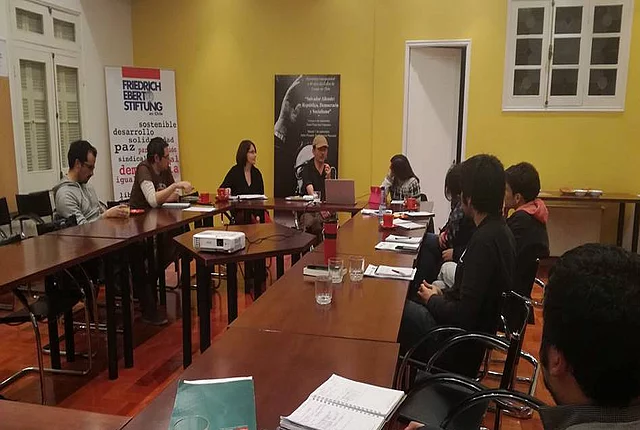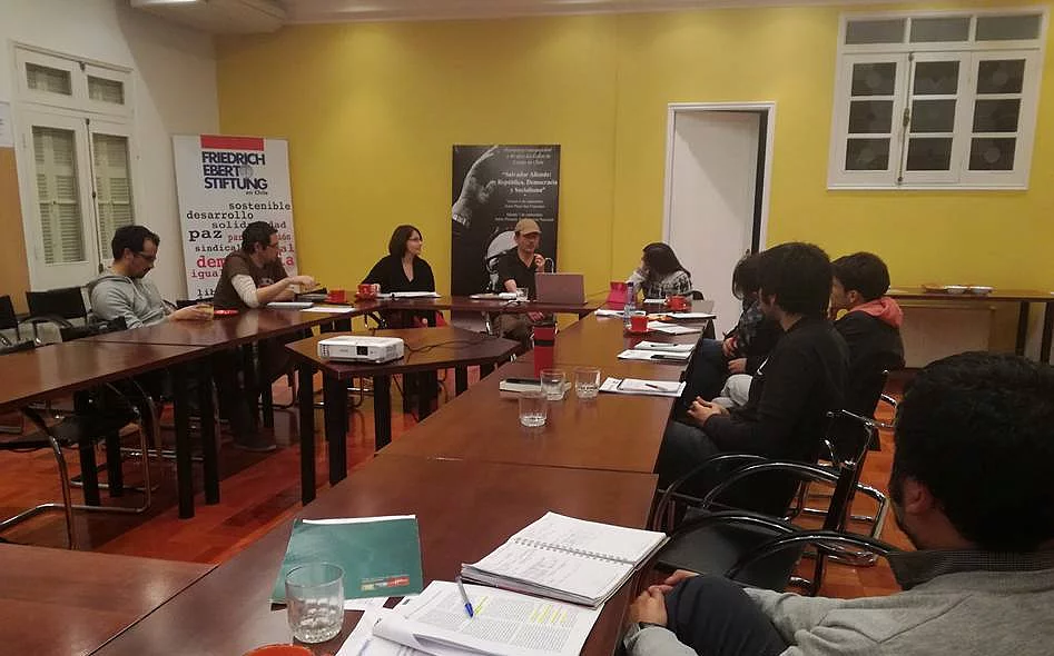 Segunda Mesa Sindical de Jóvenes 08/08/2017 22:00 to 01/01/1970 00:00 - Fundación Friedrich Ebert Para esta segunda sesión de trabajo, los jóvenes sindicalistas conversaron con Álvaro Cálix, del proyecto regional Proyecto de Transformación Social-Ecológica de la FES y Catalina Cifuentes de la Fundación Decide ¿Cómo se puede caracterizar el modelo de desarrollo en Latinoamérica? ¿Se puede superar ese modelo de desarrollo? ¿Cuáles son probables respuestas desde el progresismo? Estas preguntas dieron inicio a la segunda sesión de trabajo con jóvenes sindicalistas en la Mesa Sindical de Jóvenes, realizada el pasado 9 de agosto en la FES en Santiago de Chile. Álvaro Cálix, coordinador regional del Proyecto de Transformación Social-Ecológica de FES en Sudamérica, y Catalina Cifuentes, presidenta de la Fundación Decide, fueron quienes desde sus experiencias guiaron la discusión con los y las dirigentas sindicales participantes de la actividad. Álvaro inició la conversación señalando los modelos en los cuales los diversos países de la región han transitado desde el comienzo de su inserción en los mercados internacionales (desde 1870 aproximadamente hasta la actualidad) en un cambio desde el agroexportador –donde el rol de los puertos era fundamental-, la sustitución de importaciones -promovida por CEPAL, donde se observó el crecimiento de las ciudades, olvidando el agro, quien siguió produciendo pero a un menor valor-; modelo neoliberal –donde la propuesta era abrir el mercado a la inversión extranjera, quienes reclamaban nuevamente materias primas pero incorporando demanda de mano de obra a bajo costo-, y finalmente un modelo que vuelve al extractivismo pero bajo un control de gobiernos progresistas, que aumentan los impuestos o tienden a nacionalizar ciertos recursos estratégicos, pero sin superar el modelo basado en la explotación de materias primas. A partir de esta reflexión, Catalina, quien junto a DECIDE ha trabajado en zonas de sacrificio en la región de Atacama, señaló que dada la no superación de esta sobreexplotación de materias primas se coarta el crecimiento social (incluido el sindical), observando estas prácticas tanto en la minería o el forestal. La discusión prosiguió sobre el rol del Estado en la posible superación de esta condición, señalando que la existencia de instituciones como el Ministerio de Medioambiente, lejos de promover una agenda diferente ha servido como observador pasivo y facilitador de este modelo. Sobre el rol del sindicalismo en este proceso, observan cómo las formas de organización del trabajo, junto con el crecimiento y el desarrollo tecnológico, construye mercados de trabajo a bajo costo, yendo hacia mercados de poca regulación, generando un modelo en el cual los trabajadores transitan hacia informalidad o flexibilización laboral –muchas veces sin posibilidades de sindicalización- generando una tensión entre capital y trabajo, el cual desde la propuesta de superación del modelo exportador de materias primas, comienza a transitar hacia una tensión capital-territorio. Catalina fue enfática en la necesidad de generar alianzas desde el sindicato y sus dirigentes con las demandas locales y las organizaciones medioambientales, quienes en conjunto pueden trabajar hacia la superación de esa tensión capital-territorio, dado que enfrentan situaciones comunes como la dicotomía que se establecen en comunidades afectas por la instalación de empresas que afectan el medioambiente y la calidad de vida de las comunidades adyacentes, pero que a la vez son entendidas como fuentes de ingresos económicos tanto directos como indirectos a raíz de la explotación de los recursos. Estas reflexiones dieron paso a las intervenciones de los asistentes, quienes señalaron desde sus organizaciones, como la portuaria o el sector público, cuales son los roles que poseen las organizaciones para la promoción de una defensa de los recursos económicos con el crecimiento local. Foto: Walter Cubillos