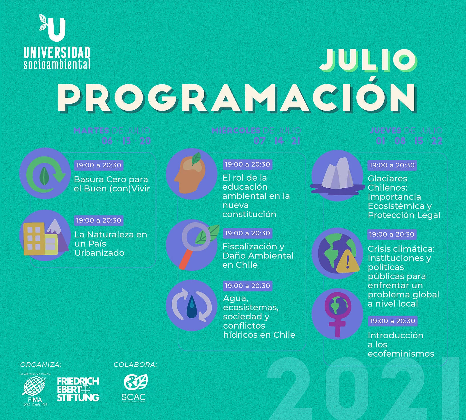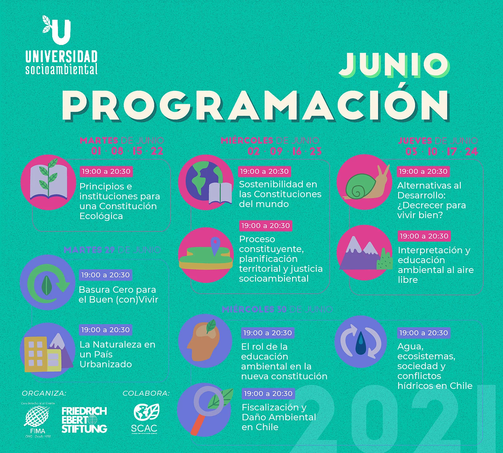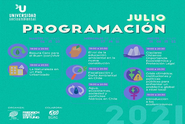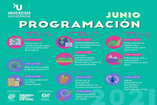 Actividades Transformación social-ecológica Noticias Universidad Socioambiental 2021 08.06.2021 FIMA y FES Chile con apoyo de SCAC te ofrecen 13 cursos gratuitos sobre medio ambiente y crisis climática ¡Todavía te puedes inscribir para los cursos de la Universidad Socioambiental organizada por FIMA y FES Chile con apoyo de la Sociedad Civil por la Acción Climática (SCAC)! “Estamos muy felices de darle continuidad a este proyecto que desde el 2019 venimos realizando desde ONG FIMA y SCAC, este año con el valioso apoyo de la fundación Friedrich Ebert”, señala Juan Joaquín Aedo Coordinador de la iniciativa desde ONG FIMA. En esta ocasión, y en razón del contexto histórico que vive el país, el objetivo de estas clases será ser un espacio educativo y de reflexión ciudadana respecto a los principales desafíos en el marco del cambio constitucional. Por ello, el tema principal es la «Nueva Constitución y los desafíos ambientales de Chile» y contará con 13 cursos, tales como Sostenibilidad en las Constituciones del mundo; Interpretación y educación ambiental al aire libre; La naturaleza en un país urbanizado; Agua, ecosistemas, sociedad y conflictos hídricos en Chile; Introducción a los ecofeminismos; y más. “La gran acogida que tiene esta iniciativa educativa y de reflexión, da cuenta del interés de las comunidades por los desafíos ambientales y la oportunidad que representa el cambio constitucional para construir una nueva relación entre la sociedad y el medio ambiente, que nos permita vivir de manera armónica”, menciona Aedo, y se respalda con las más de 1.700 inscripciones que ya van en menos de 24 horas. Los cursos serán dictados por diferentes especialistas, organizaciones activistas ambientales y profesores universitarios de manera gratuita, y se llevarán a cabo entre el 1 de junio y el 22 de julio entre 19:00 y 20:30 hrs. Cabe destacar que cada curso cuenta con 4 clases virtuales de 90 minutos y, al igual que la versión anterior, se certificará a alumnas y alumnos que tengan asistencia completa al curso inscrito. Una vez finalizadas, quedarán disponibles en la página web para todas y todos quienes se hayan inscrito. Las inscripciones e información completa de los cursos están disponibles en el sitio web de Universidad Socioambiental.
