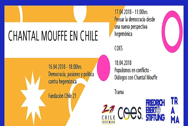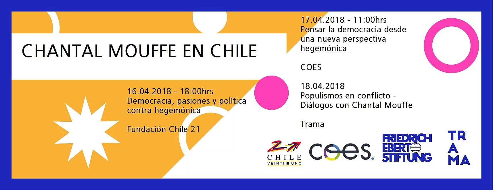 Visita de Chantal Mouffe en Chile Filósofa belga participa en varios espacios en visita a Chile para dialogar sobre temas como la democracia y el populismo En la semana del 16 al 20 de abril 2018 la filósofa belga, Chantal Mouffe, estaba de visita en Chile. Durante su estadía participó en varias actividades para compartir sus estudios sobre todo respecto a la democracia y el populismo. Acá les compartimos los registros de estas actividades. 17.04.2018: Cátedra abierta en la Aula Magna de la FEN, Santiago, organizada juntos con el Centro de Estudios de Conflicto y Cohesión Social (COES). Grabación del streaming disponible en YouTube. 18.04.2018: Populismos en conflicto - Diálogos con Chantal Mouffe. Actividad con la revista Trama en el Museo de la Memoria. Vídeo disponible en nuestra página en Facebook.